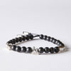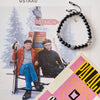 This is Ski, named after the sport of snow skiing. It is made from black onyx beads from India, custom designed sterling silver pieces and two 100% sterling silver Billy Baker Co. logo pieces on a black silk cord. The pieces represent a snowy mountain, ski goggles and a double black diamond symbol. Do not après-ski without it.