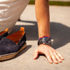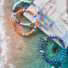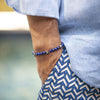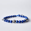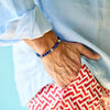 This is Sun, named after the love of the beach. It is made from blue matte Lapis Lazuli beads from Afghanistan, custom designed sterling silver pieces and two 100% sterling silver Billy Baker Co. logo pieces on a blue silk cord. The pieces represent a beach ball, the sun, and a star fish. Don't even think of hitting the beach without it.