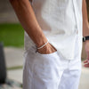 This is White Party, made from bright all-white glass beads from Africa and our 100% sterling silver Billy Baker Co. logo piece.
