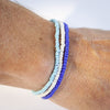 This is the Costa Del Sol Stack, named after the coastal haven in Andalucía, a southern region of Spain. The stack is made of of cobalt blue, white and pastel blue tiny glass seed beads and a 100% sterling silver Billy Baker Co. logo piece.