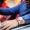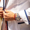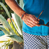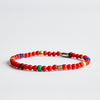 This is Adolfo, named after the restaurant Da Adolfo in Positano, Italy. It is made from dyed red coral beads from the Philippines, a colorful assortment of African Christmas beads and a 100% sterling silver Billy Baker Co. logo piece.