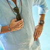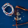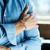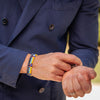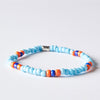 This is Consequences, named after the New Mexico town Truth and Consequences. It is made from hand-beaded small turquoise, orange and cobalt blue glass beads from Africa in a color-block pattern and a 100% sterling silver Billy Baker Co. logo piece. Pair with Truth for a great stack.